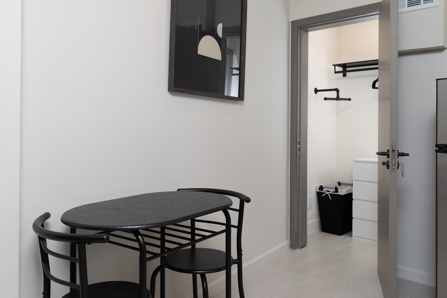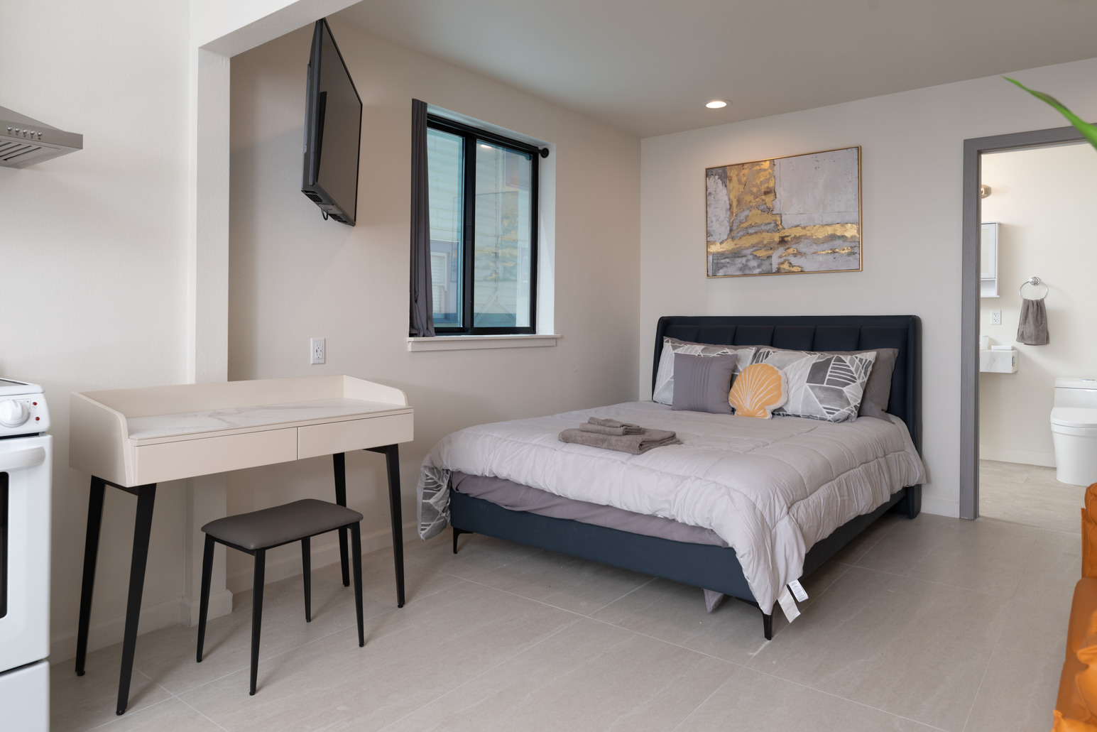 The large studio suite is located in the NOBE neighborhood on the border of Oakland and Berkeley. With ample living space and a large closet there is plenty of room for you to relax when not at work. The bathroom is ADA sized so there is plenty of space. Full kitchen, desk & couch among other great features in this new build.
