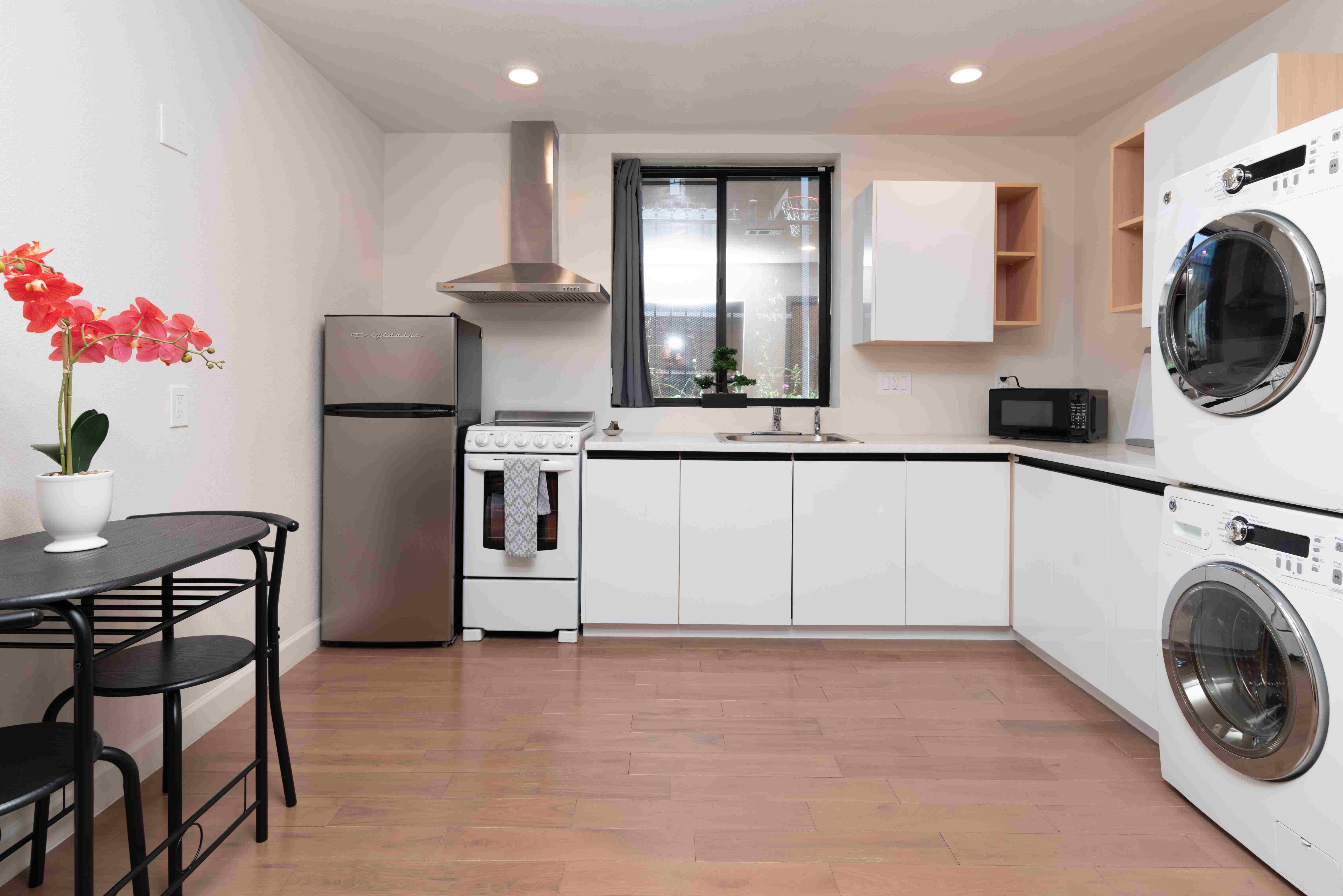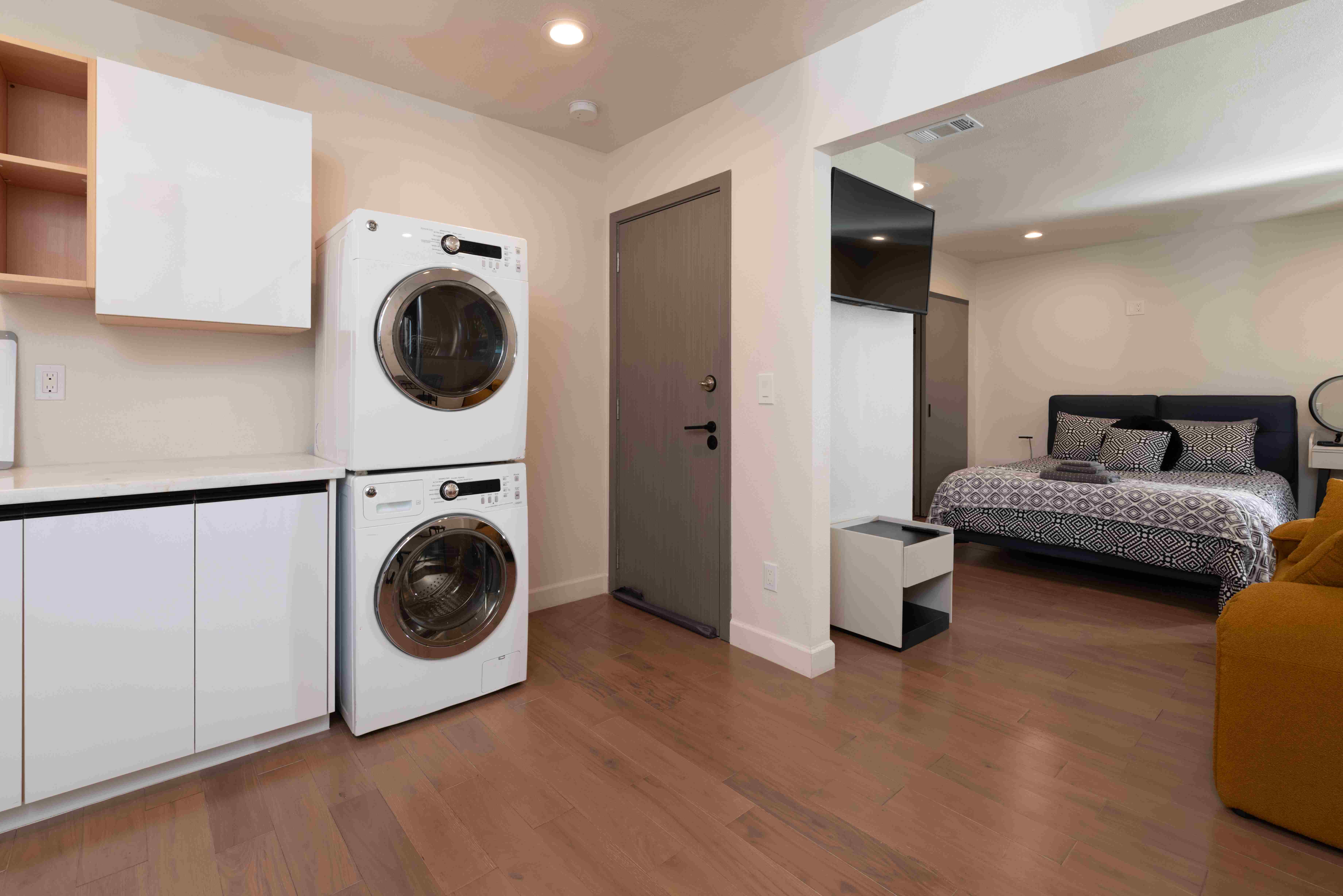 Brand new large 830 sq ft unit with high end furniture. Large private bathroom with full kitchen and amenities. The listed square footage does not include the large restroom with walk-in shower. This unit has washer and dryer inside the unit. Enter the unit from a gated and secure area. The backyard is totally gated.
