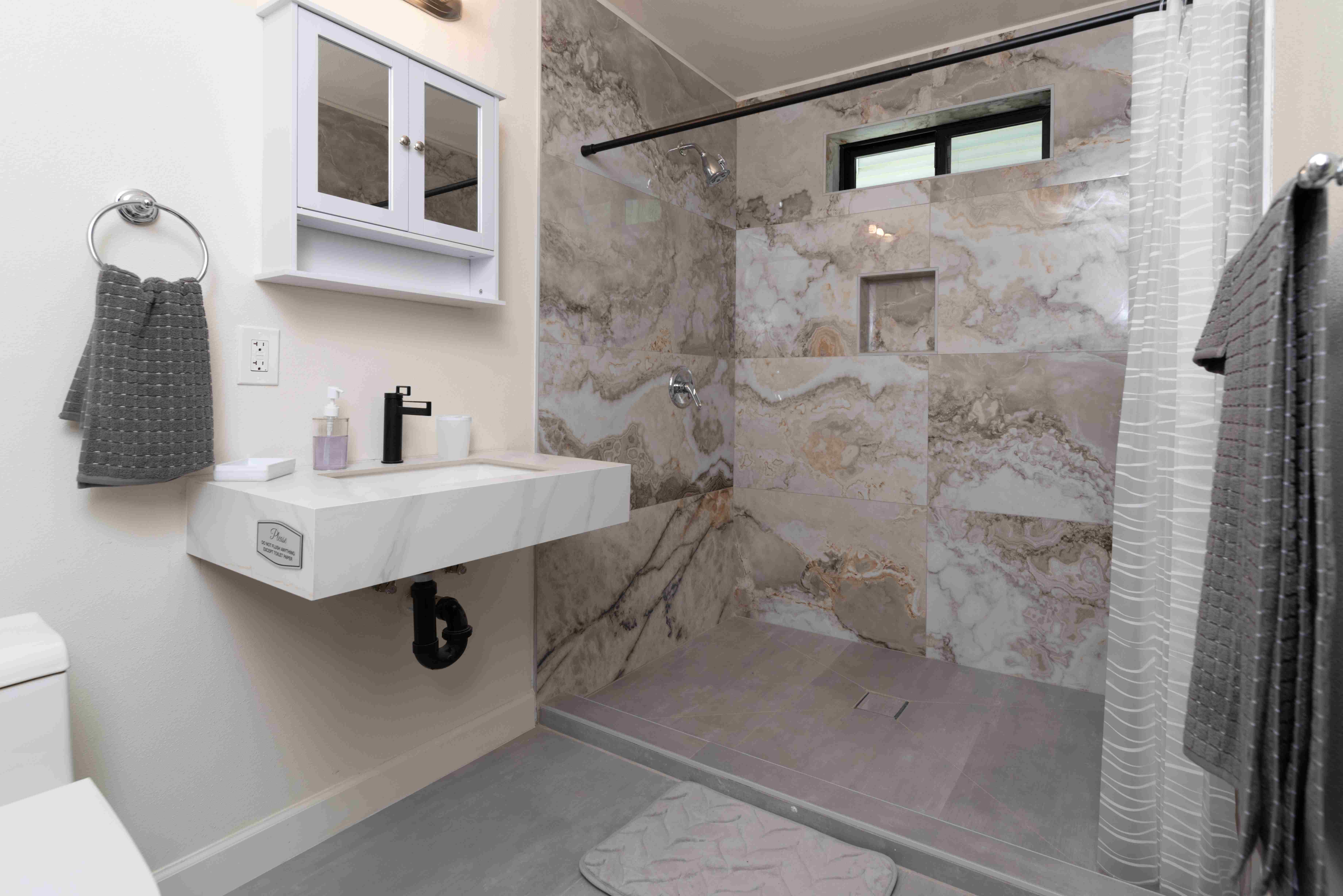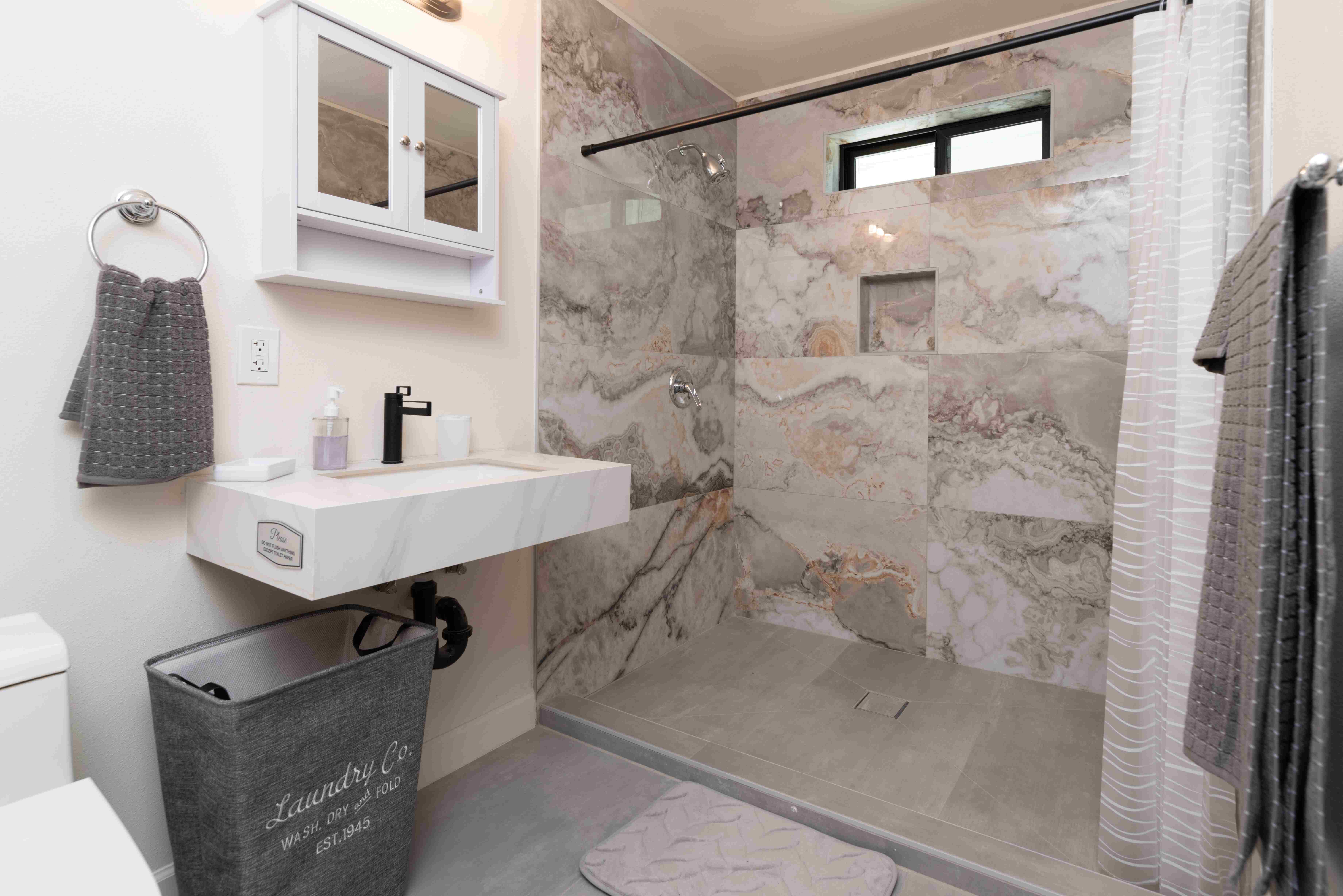 Private bathroom with floor to ceiling tile with spacious walk-in shower.